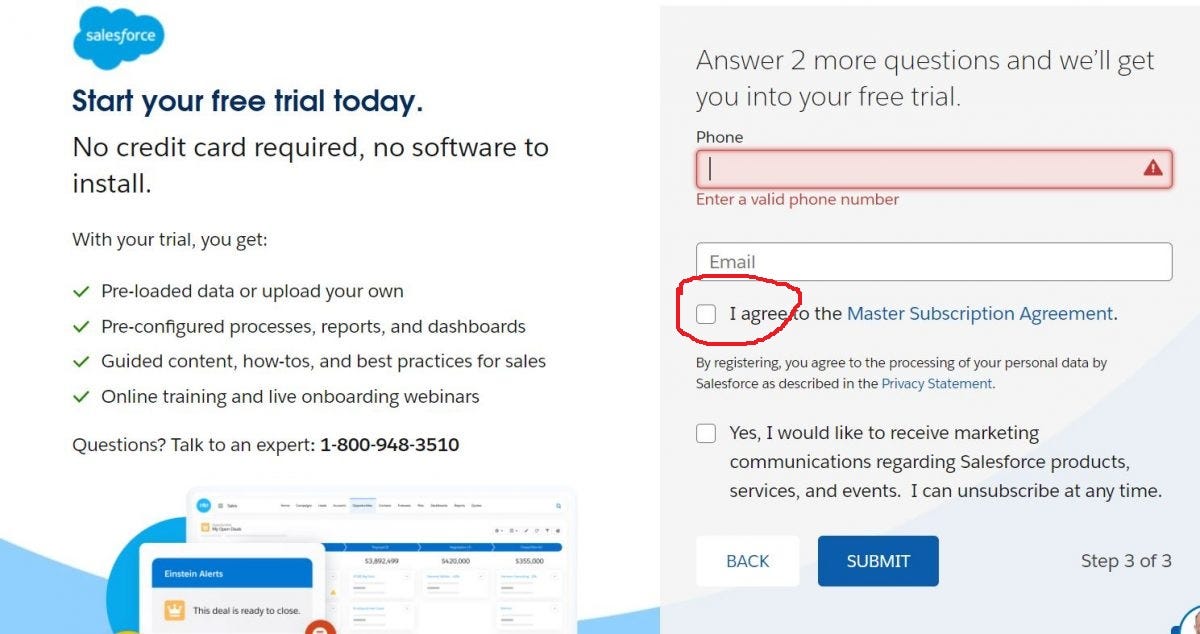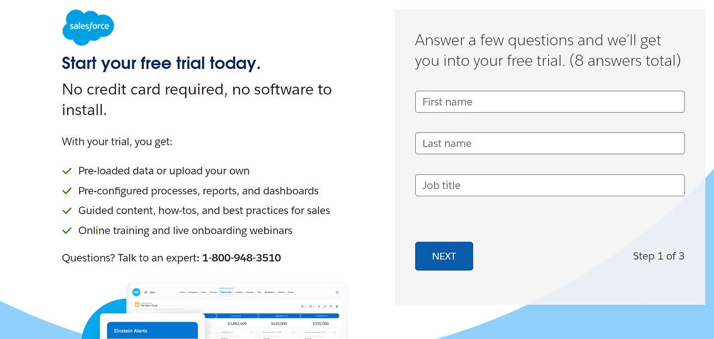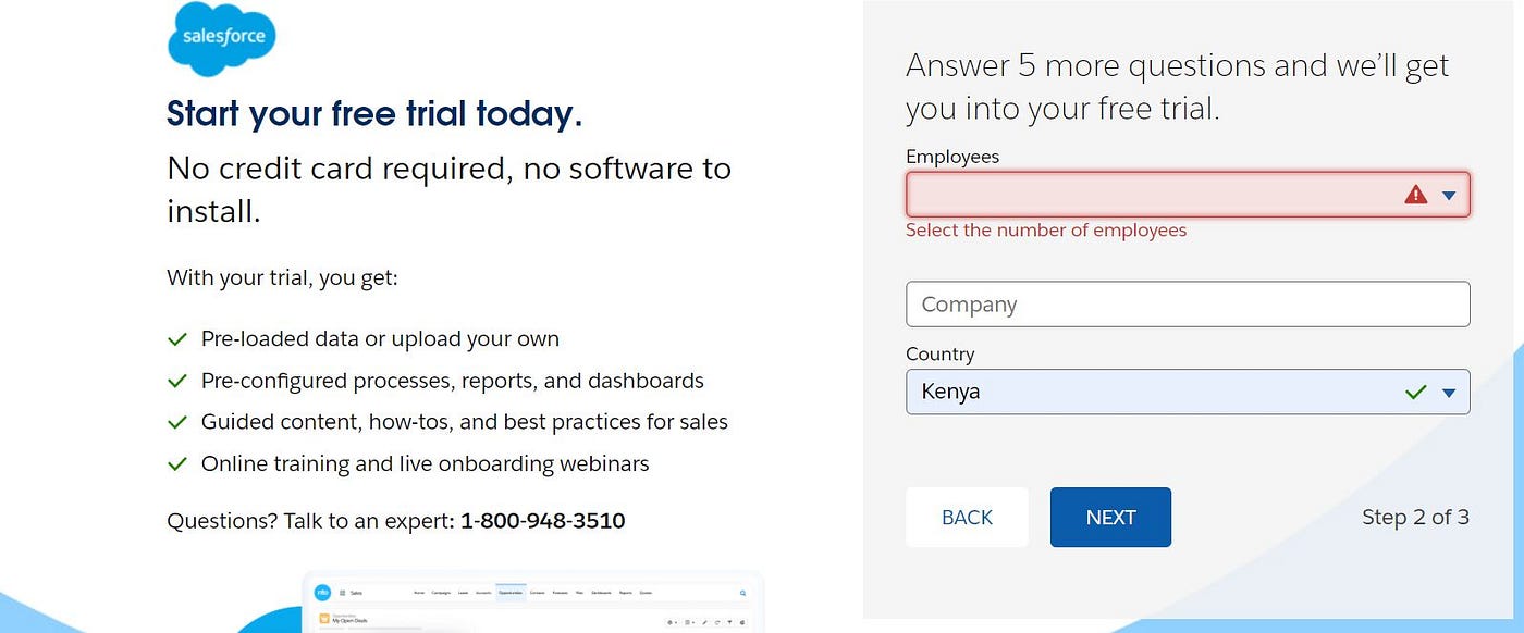 Also, notice how in all the forms, Salesforce communicates a clear offer (what I must give or rather what I don’t need to have; credit card) and explains what I am signing up for.