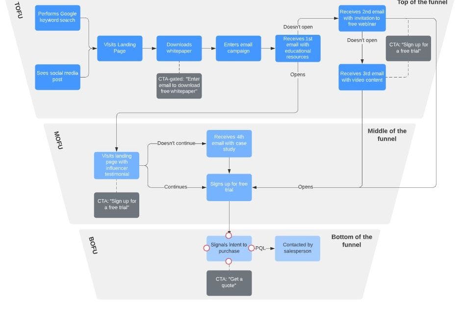 For example, when selling software, the strategy might be to drive traffic to a landing page. On the landing page, the goal might be to get people to download a whitepaper. After leads download a whitepaper, the next step is to get the lead to sign up for a free trial. After the lead signs up for the free trial, the next step is to sell the software to them.